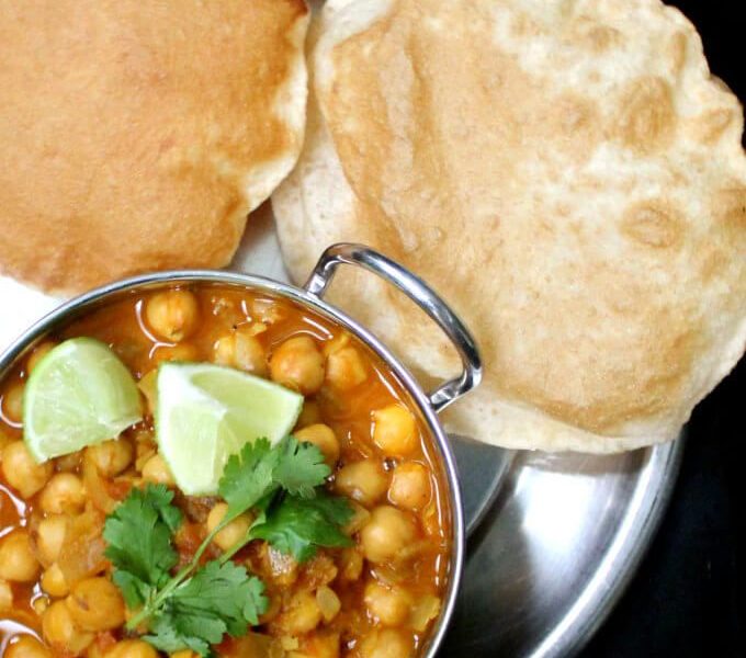 Garbanzo beans cooked in special blend of spices with puffed leavened bread